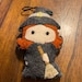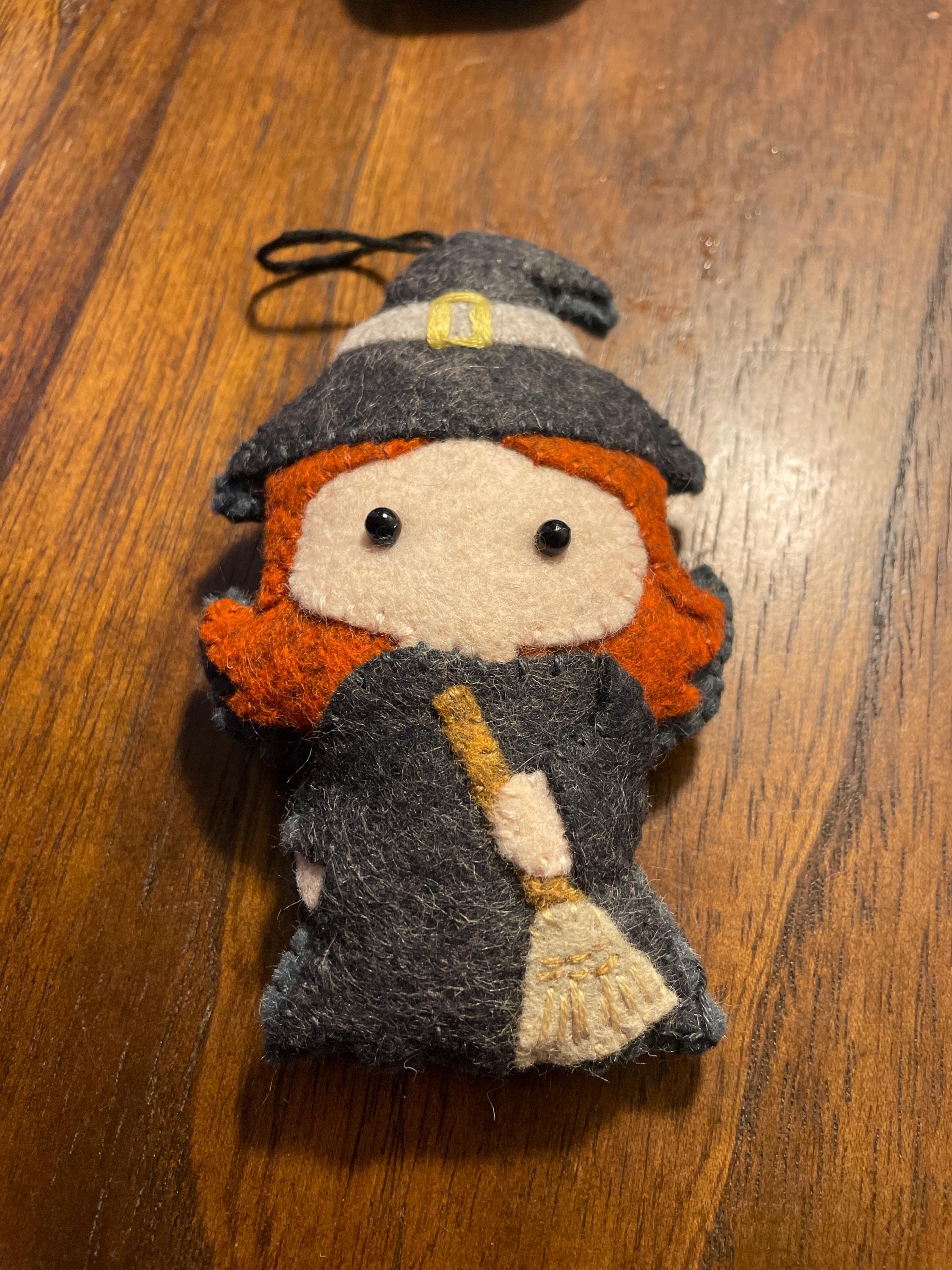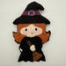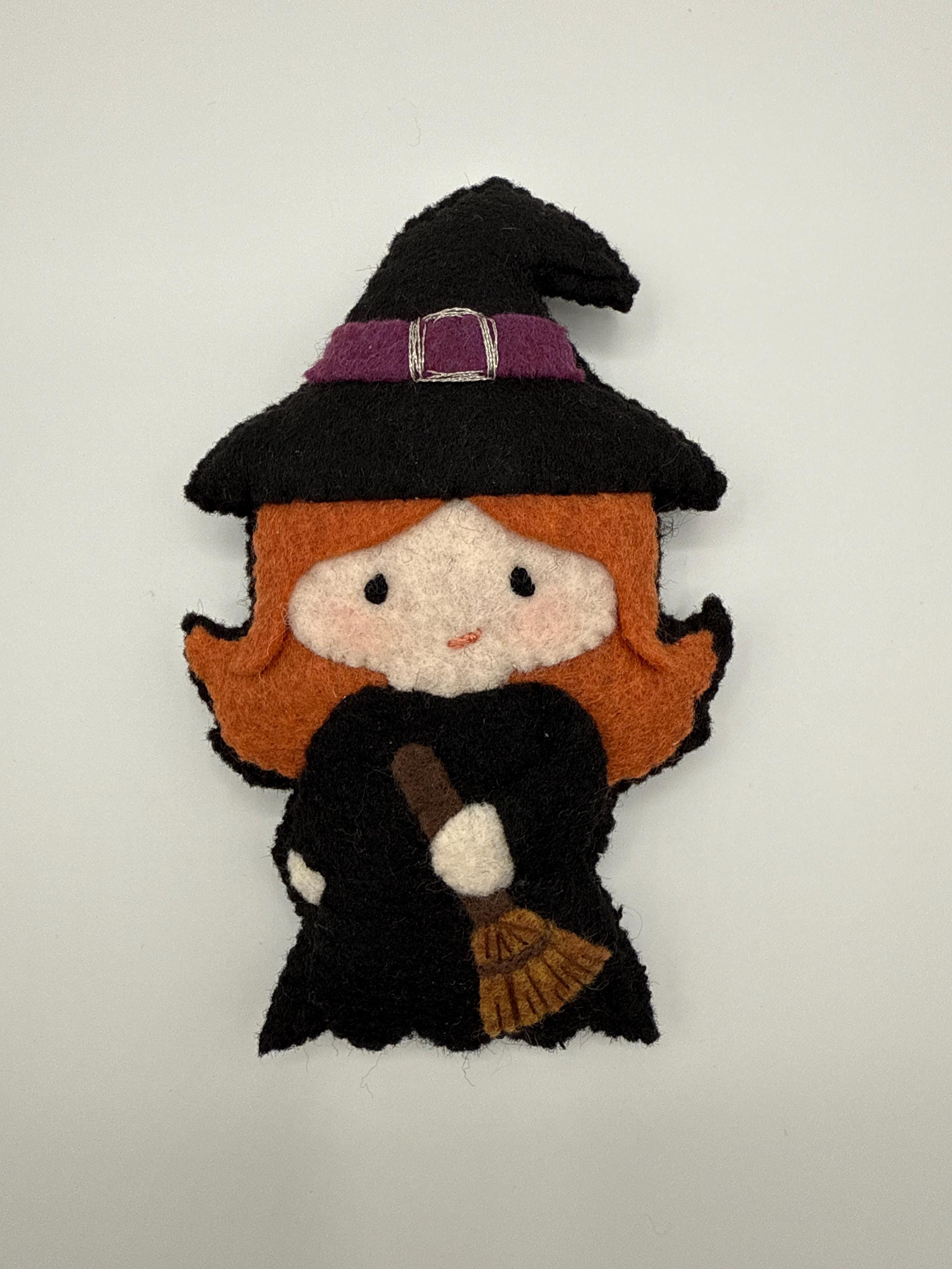 This cute little witch is here to help you get in the spooky spirit! Make one for a gift, toy, or to decorate your home for Halloween! Finished ornament will measure approximately 4.5 inches tall.